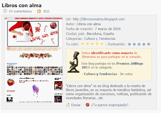 Hola de nuevo. No pensaba publicar nada hasta después de fiestas, pero se me olvidaba que hoy empiezan las votaciones de los 20blogs, así que a la derecha tenéis el banner para votar cuando os apetezca.